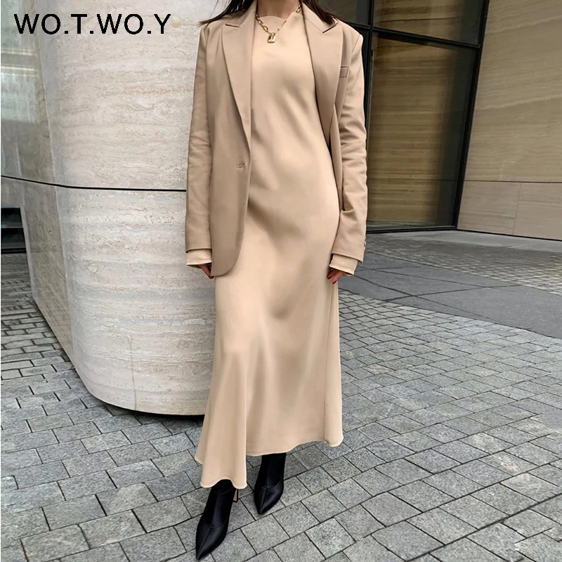 Best Dress from WO.T.WO.Y Official Store for Satin Dress Mid-Long Femme Robe Long-Sleeve WOTWOY Elegant Women Vestidos Cotton Solid