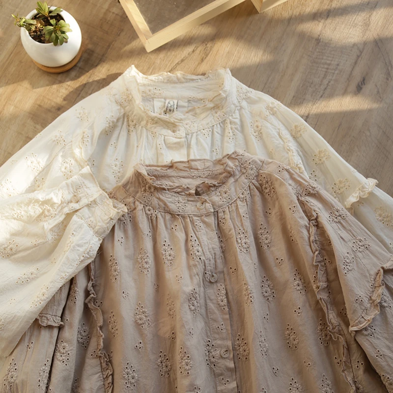 thanks to B&Y Store for Shirt Blouse Embroidery Beige Collar Ruffles Japanese-Style Boutique Hollow-Out Cotton